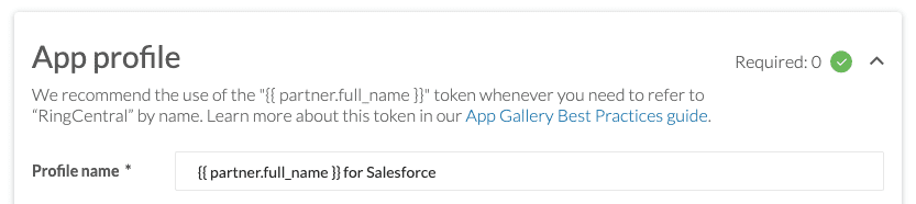 We recommend that the profile name of all apps be qualified to each partner they apply to. For example, the Salesforce integration produced by RingCentral has a profile name of "{{ partner.full_name }} for Salesforce" as shown below:
