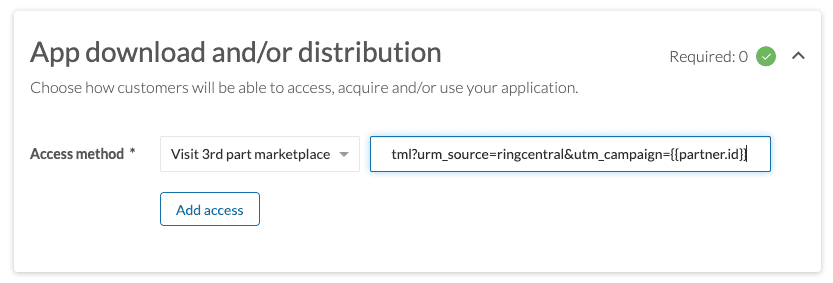 For example, the text below when placed in your app's "Access method" field will construct a link with campaign code equal to the partner's short name.