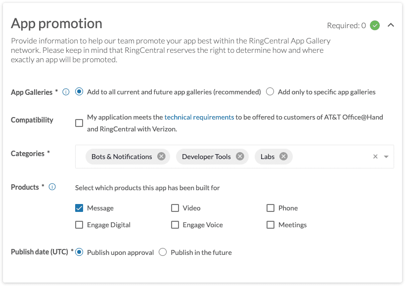 Finally, you can help RingCentral promote your app through the right channels by telling us where and how best to do that. Use the Promotion area to: