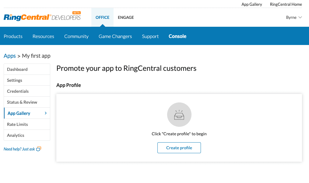 We recommend you get started by successfully creating and publishing an App Gallery Profile for the official RingCentral App Gallery. Let's begin. Login to the RingCentral Developer Console, then from your list of application, select the one you would like to promote, and then click the "App Gallery" tab. Then follow the steps below.