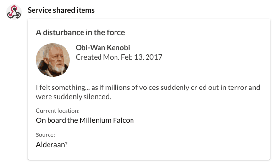 Posting the above JSON to an incoming webhook will result in a message that appears as follows: