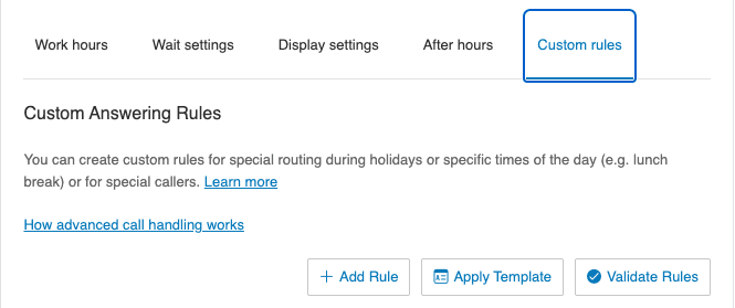 When multiple custom rules are active, the system will evaluate each rule in order. The first rule whose conditions match will determine how the call is handled. If none of the active custom rules match the incoming call, the system will fall back to evaluating the call against the Business Hours or After Hours rule, depending on the current date and time.