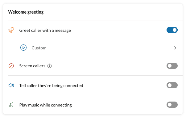 Welcome Greeting– Defines how a caller is greeted when a call is received, while connecting and being connected.Ring Settings– Defines how the call rings before being answered or redirected.