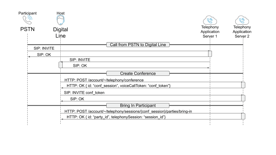 Now that a conference has started, and you have established a Session Initiation Protocol, you can add parties to the call using the telephony session ID of the conference call (id). The telephonySessionId found in the path is the conference session ID (id). The telephonySessionId in the body is the initial call from the outside party to the agent (host). A maximum of 10 parties can be added to a conference call with only 1 call party allowed to join a conference per request.